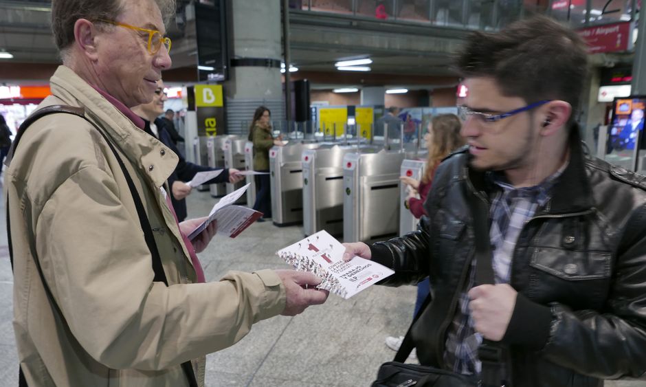 CCOO y UGT han repartido este jueves propaganda del 1º de Mayo en lo intercambiadores de transporte de la Comunidad de Madrid. En el reparto de la estación de Atocha han estado los secretarios generales de CCOO, Jaime Cedrún, y UGT, Carmelo Ruiz de la Hermosa.