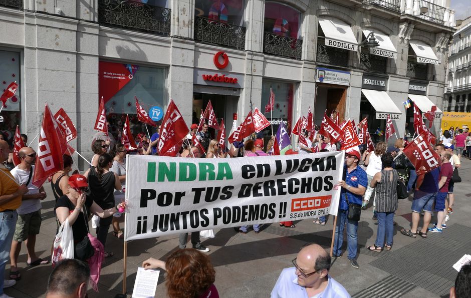 CCOO convocó una concentración ayer en la tienda de Vodafone de la Puerta del Sol de Madrid para protestar contra los despidos en Indra BPO. Desde la sección sindical de CCOO denuncian la pérdida continuada de proyectos en Indra, por parte de la empresa Vodafone, que desembocan en despidos. Asimismo, el sindicato pide la reubicación de más de 600 personas afectadas.