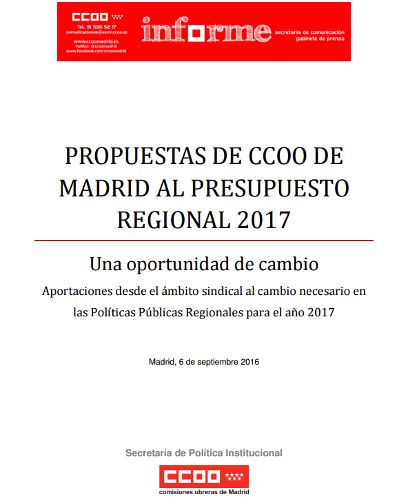 Mañana, día 7, se inicia el debate del estado de la región de Madrid. Un debate que tiene como horizonte cercano la aprobación de los presupuestos generales de la región para 2017. Se trata de las primeras cuentas regionales que se ejecutan tras concluir un presupuesto completo por el actual Gobierno regional, que no cuenta con mayoría absoluta.