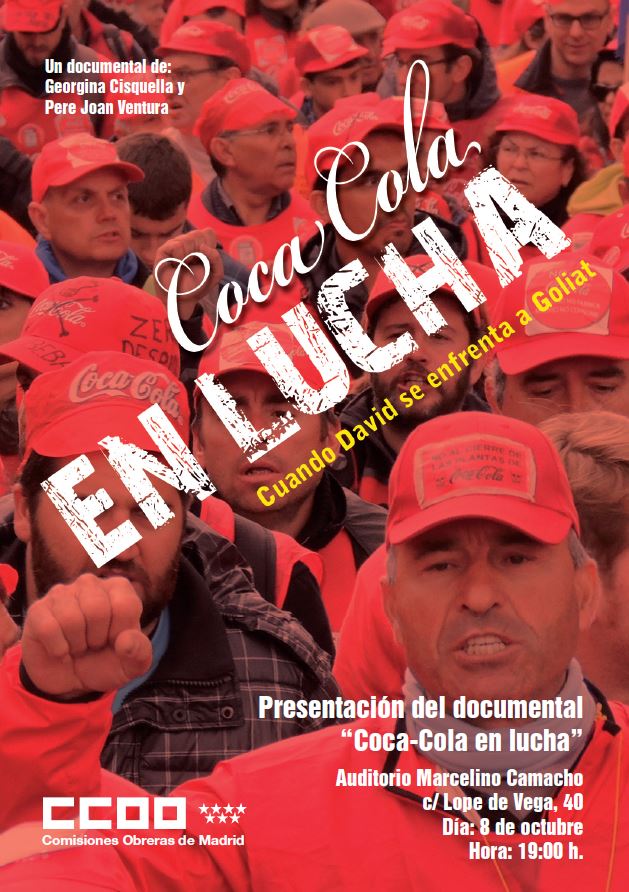 El próximo sábado 8 de octubre se presentará el documental "Coca Cola en Lucha", elaborado por Georgina Cisquella y Pere Joan Ventura y con la colaboración de CCOO. Una película protagonizada por todos los trabajadores y trabajadoras de la planta de Coca-Cola de Fuenlabrada, que lucharon junto a sus familias y consiguieron vencer a la multinacional y por los compañeros y compañeras de otras luchas laborales que se apoyaron mutuamente.
