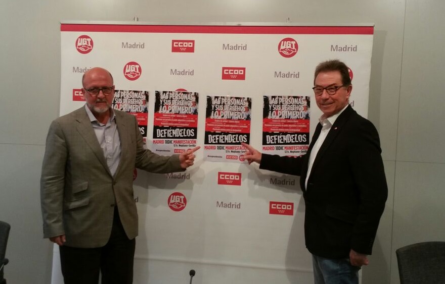 CCOO y UGT de Madrid han presentado este lunes la movilización del 18 de diciembre en defensa de las personas y sus derechos, llamando a la ciudadanía madrileña a que se una a la manifestación convocada a las 12 horas desde Neptuno a Sevilla.