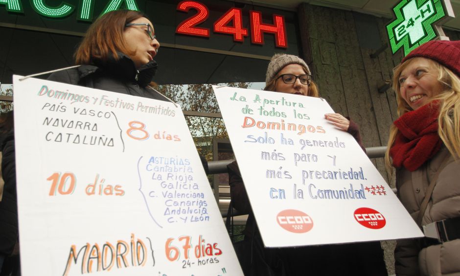 CCOO, basándose en las encuestas anuales de comercio que publica el Instituto Nacional de Estadística, aclara que el descenso en número de locales y de personal ocupado en Madrid es mayor en Madrid que en otras regiones con más restricción de horarios.