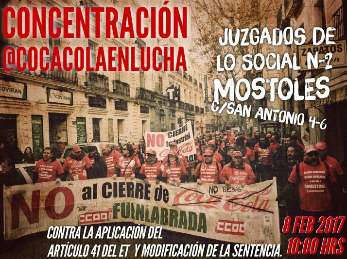 Mañana miércoles, 8 de febrero, a las 10 horas, en el Juzgado de lo Social número 2 de Móstoles (San Antonio, 4-6), tendrá lugar el juicio por la denuncia presentada por la plantilla de Coca- Cola en Fuenlabrada contra el auto judicial que modificaba la sentencia del Tribunal Supremo en la que se establecía la readmisión de los trabajadores en sus mismos puestos y en las mismas condiciones que tenían antes de los despidos.