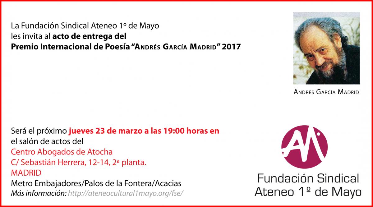 El próximo jueves, 23 de marzo, a las 19 horas, en el centro Abogados de Atocha (Sebastián Herrera, 12-14, 2ª planta), se entregarán los premios del certamen internacional de poesía Andrés García Madrid, convocado por la Fundación Sindical Ateneo 1º de Mayo de CCOO.