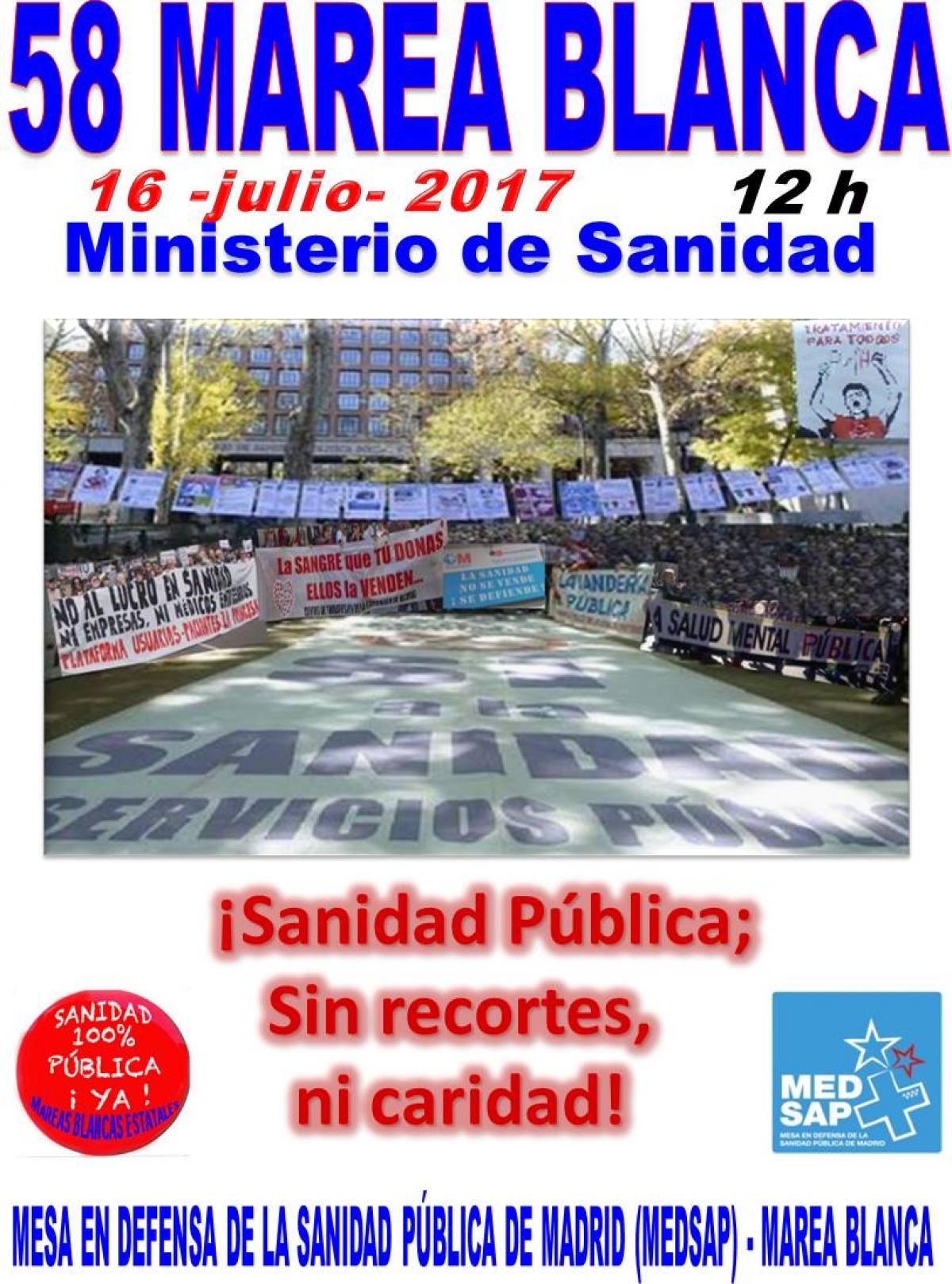El próximo domingo, 16 de julio, CCOO volverá a manifestarse junto con la Marea Blanca en defensa de la sanidad pública madrileña. La cita es a las 12 horas en el Ministerio de Sanidad, en el Paseo del Prado, con el lema “Sanidad pública; sin recortes, ni caridad”