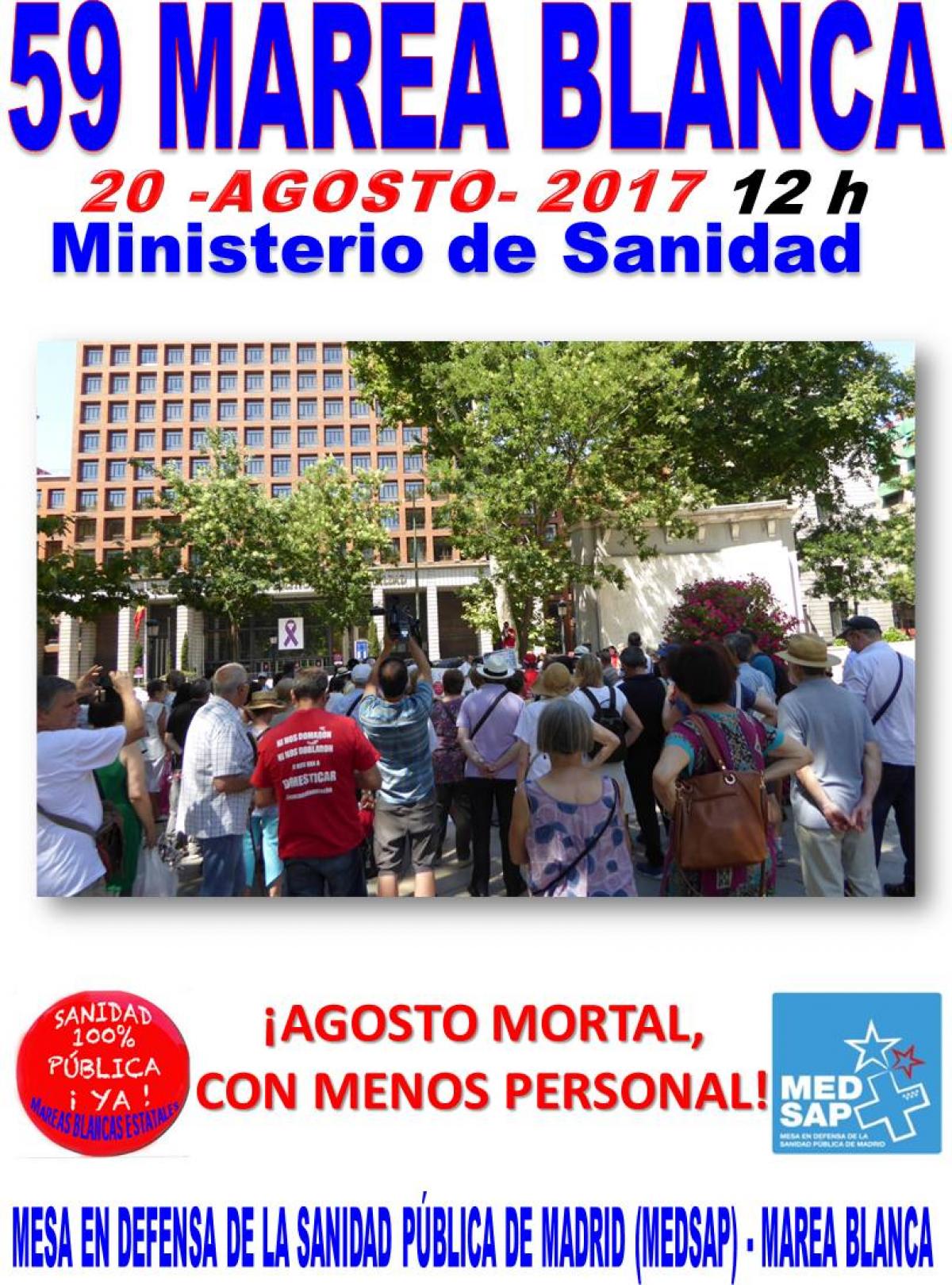 Como cada tercer domingo de mes, el día 20 vuelve la Marea Blanca en defensa de la sanidad pública madrileña. En su 59ª convocatoria, bajo el lema “Agosto mortal con menos personal”, volverá a exigir una sanidad pública libre de privatizaciones en la Comunidad de Madrid.
