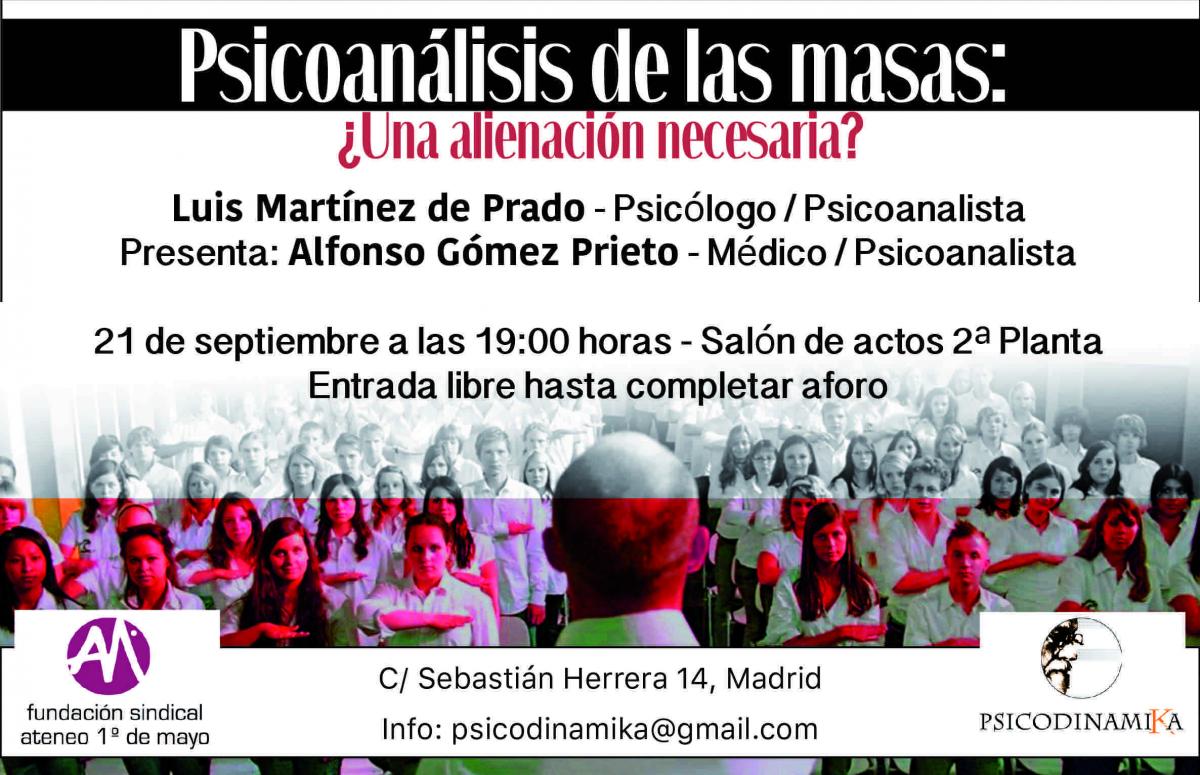 El próximo jueves 21 de septiembre Luis Martínez de Prado, psicólogo y psicoanalista, abordará un tema tan controvertido como el de las "masas". La conferencia, presentada por Alfonso Gómez Prieto, tendrá lugar en el salón de actos del centro Abogados de Atocha (c/Sebastián Herrera, 12-14, 2ª).