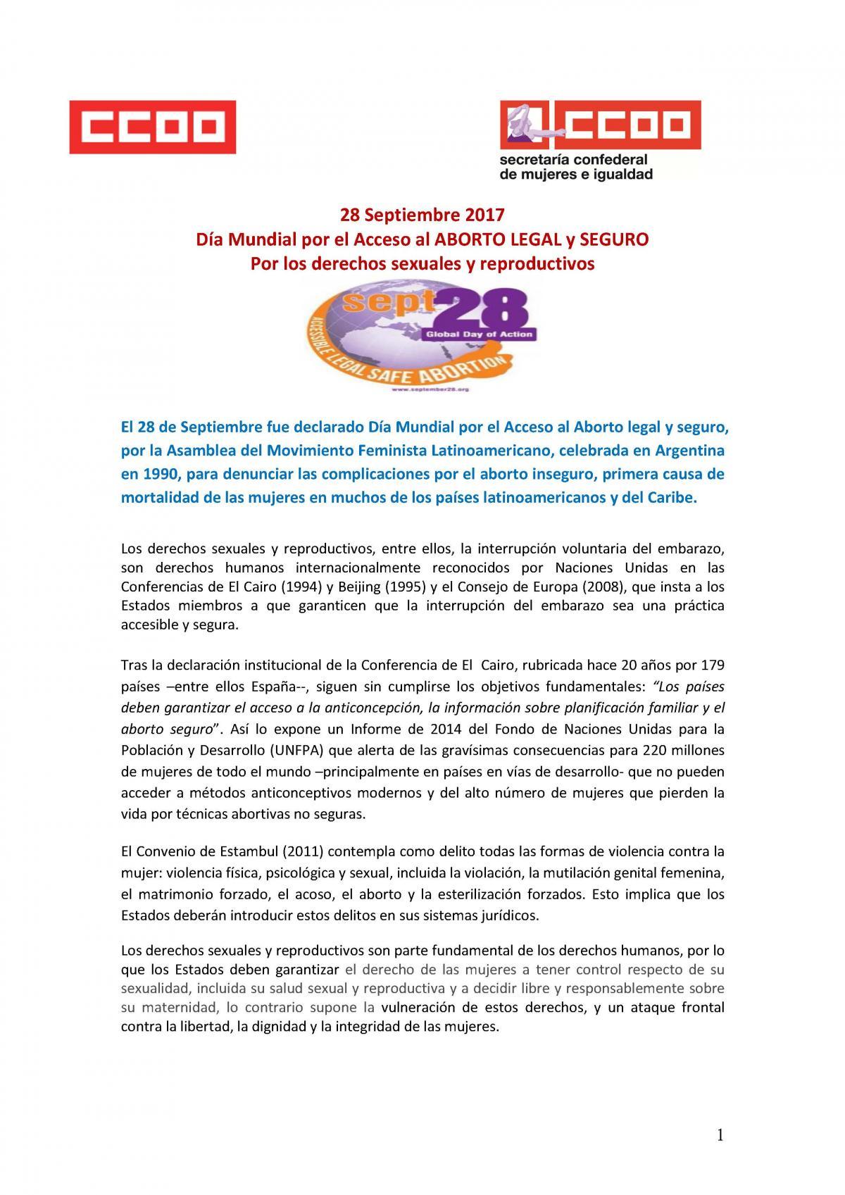 Comisiones Obreras apoya la acciones de este 28 de Septiembre, Día Mundial por el Acceso al Aborto Legal y Seguro en todo el mundo y hace un llamamiento a la participación en las distintas movilizaciones que convocan el movimiento feminista, las organizaciones de mujeres, sociales y sindicales, así como el activismo en redes sociales.
