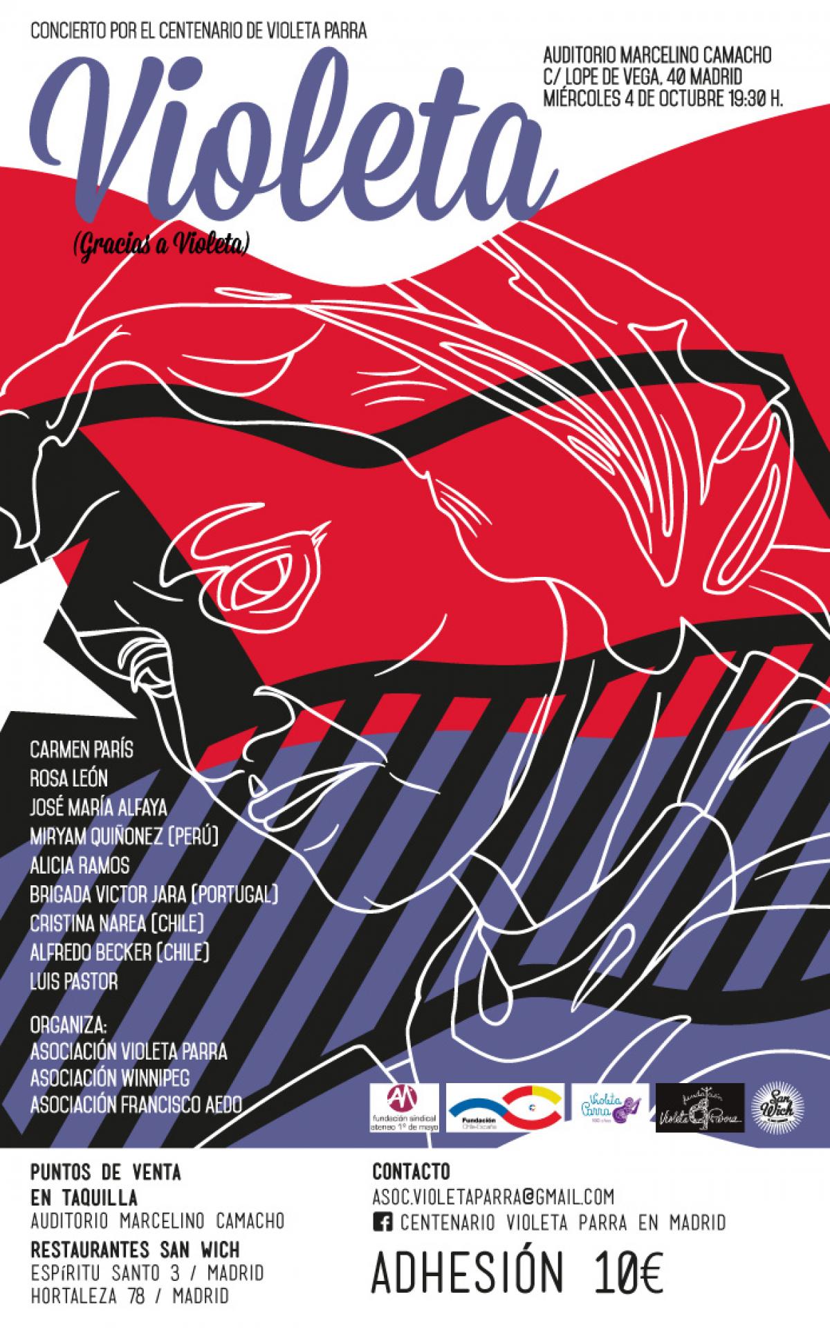 El homenaje a la cantautora chilena tendrá lugar el miércoles 4 de octubre en el auditorio Marcelino Camacho, con motivo del centenario de su nacimiento. Contará con la participación de artistas españoles como Rosa León, Luis Pastor, Carmen París. Participarán, además, Alicia Ramos, Cristina Narea y Alfredo Becker, que interpretarán los temas más destacados del amplio repertorio de Violeta Parra. Y mediante vídeoactuación se sumarán José María Alfaya y Miryam Quiñonez, desde Perú, y el grupo "Brigada Víctor Jara", desde Portugal.