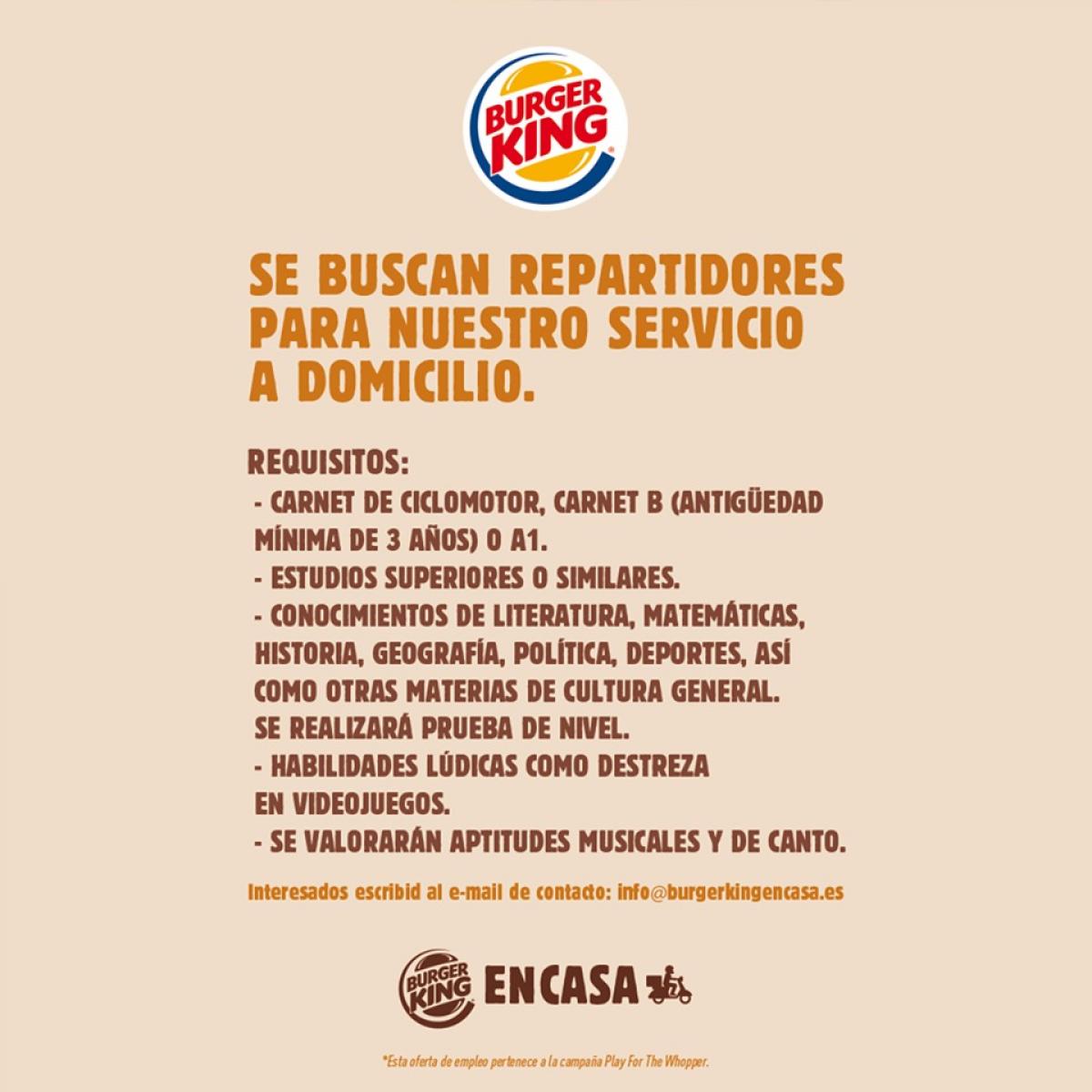 La conocida compañía de comida rápida ha iniciado una supuesta campaña de contratación de personal donde entre los diferentes requisitos, para un supuesto puesto de repartidor, son: “estudios superiores o similares; conocimiento de geografía, política; habilidades lúdicas como destreza en videojuegos; aptitudes musicales y de canto”.