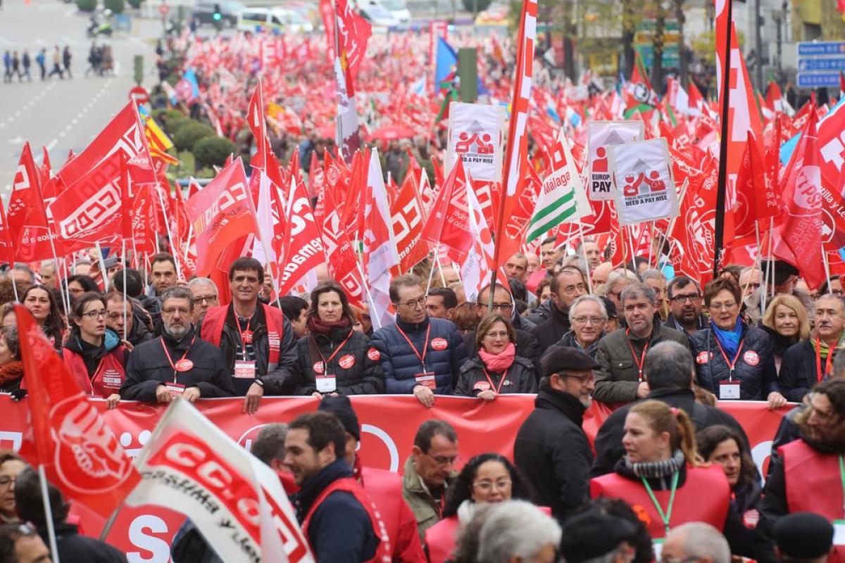 El secretario general de CCOO, Unai Sordo, junto a otros responsables confederales y los secretarios generales de las federaciones de Servicios a la Ciudadanía, Sanidad y Enseñanza del sindicato, ha participado esta mañana en la manifestación en la que, bajo el lema #AhoraloPúblico. alarios, empleo y derechos, varios miles de delegadas y delegados de todo el territorio español han reclamado al Gobierno que negocie condiciones laborales justas y la recuperación del empleo, los derechos y el salario perdido por los empleados y empleadas públicos como consecuencia de los recortes y las reformas impuestas en los últimos años