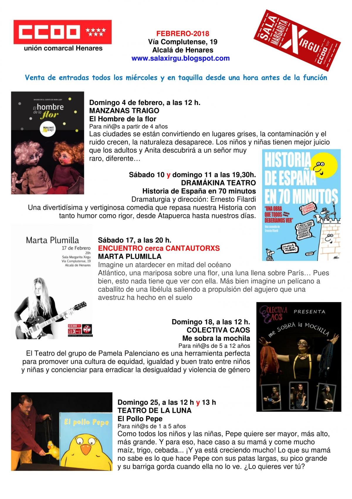 Programación de febrero de la Margarita Xirgu de CCOO en Alcalá de Henares