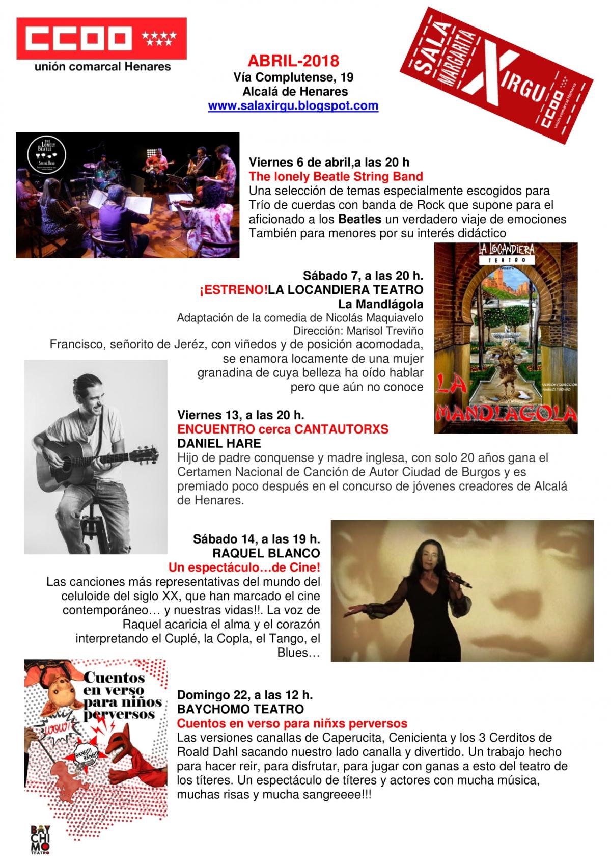 Programación de la sala Margarita Xirgu de CCOO Henares durante abril
