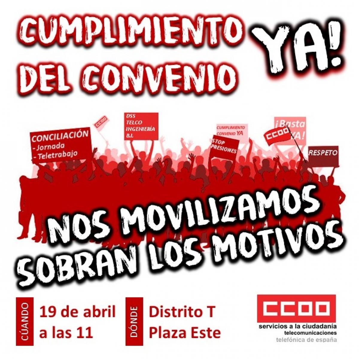 Este jueves, 19 de abril, a las 11 horas, en la plaza Este del Distrito T (Ronda de la Comunicación, s/n), CCOO convoca una concentración para exigir el cumplimiento del convenio colectivo por parte de Telefónica, que pretende implantar una nueva jornada obligatoria, de 9,30 a 17 horas, en lo que supone una nueva agresión por parte de la empresa.