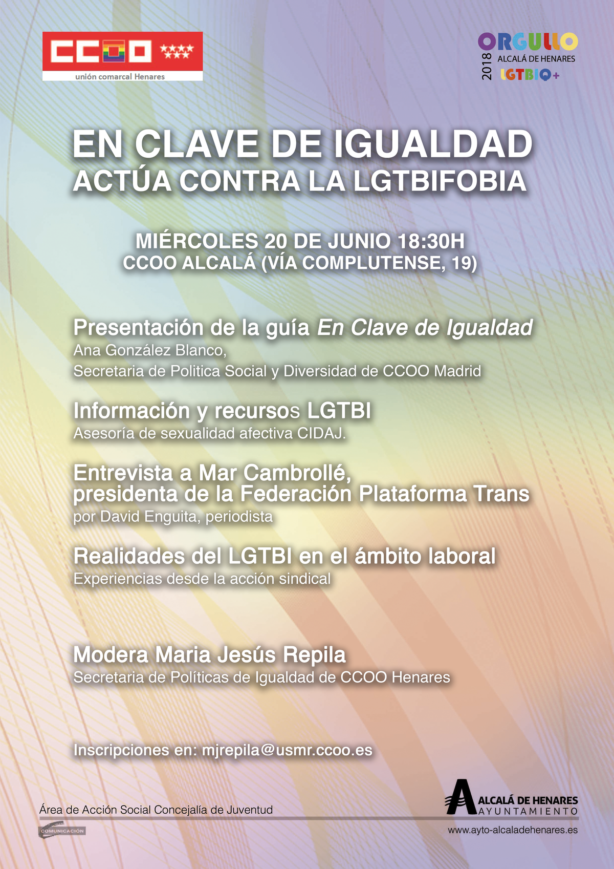 Enmarcado en las actividades del Orgullo 2018 de Alcalá de Henares, el miércoles, 20 de junio, a las 18,30 horas, en la sede de CCOO en Alcalá (Vía Complutense, 19), se va a celebrar un interesante acto en el que se presentará la guía “En clave de igualdad”, editada por CCOO Madrid. Se informará sobre recursos al respecto. Habrá una interesante entrevista, y se escucharán experiencias concretas desde el mundo laboral.