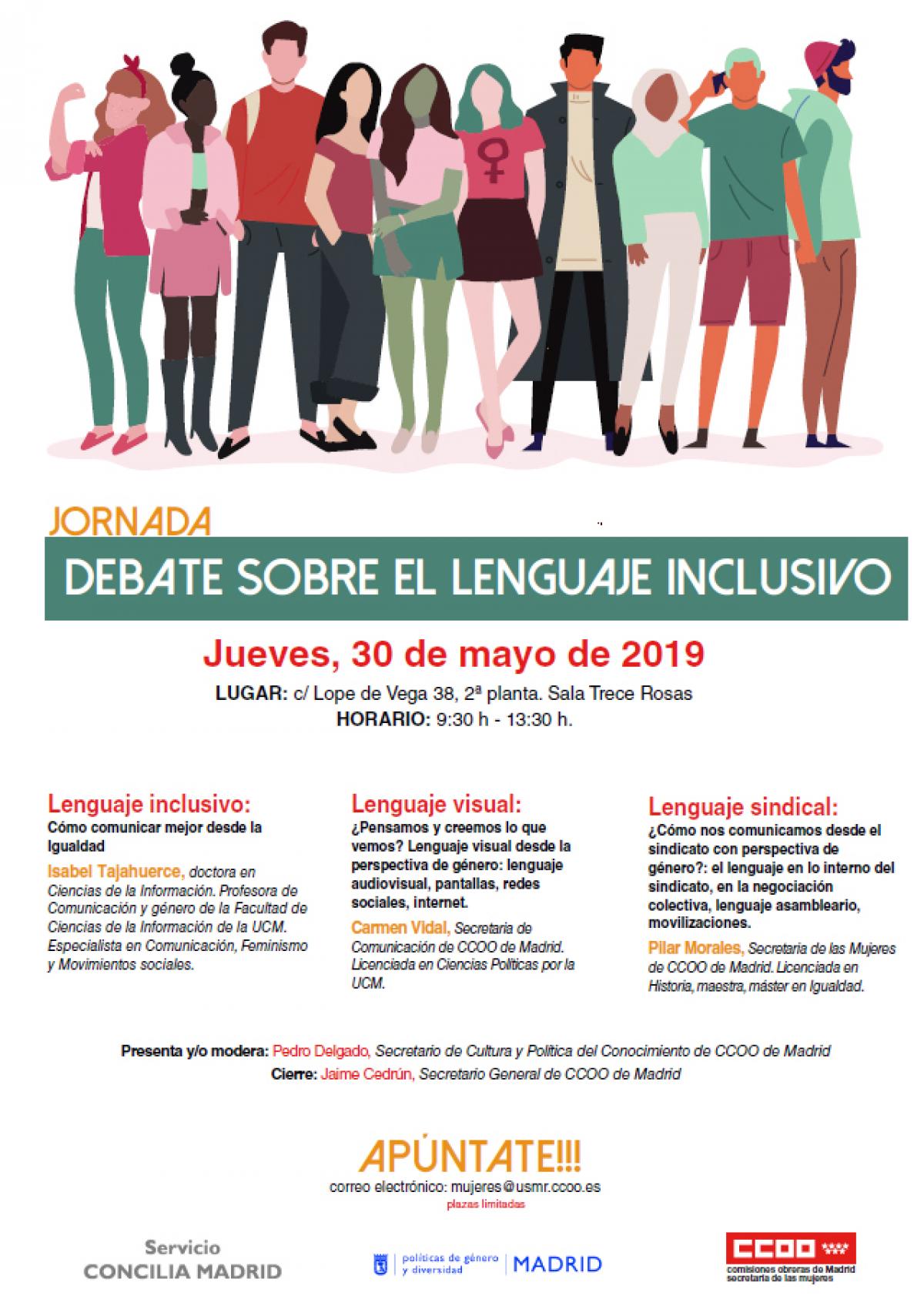 Desde la Secretaría de las Mujeres vamos a realizar una Jornada para el próximo 30 de mayo, "Debate sobre el Lenguaje Inclusivo" que esperamos que sea de vuestro interés, en lugar de realización es C/Lope de Vega, 38, 2ª planta en la Sala Trece Rosas, a las 9.30h.