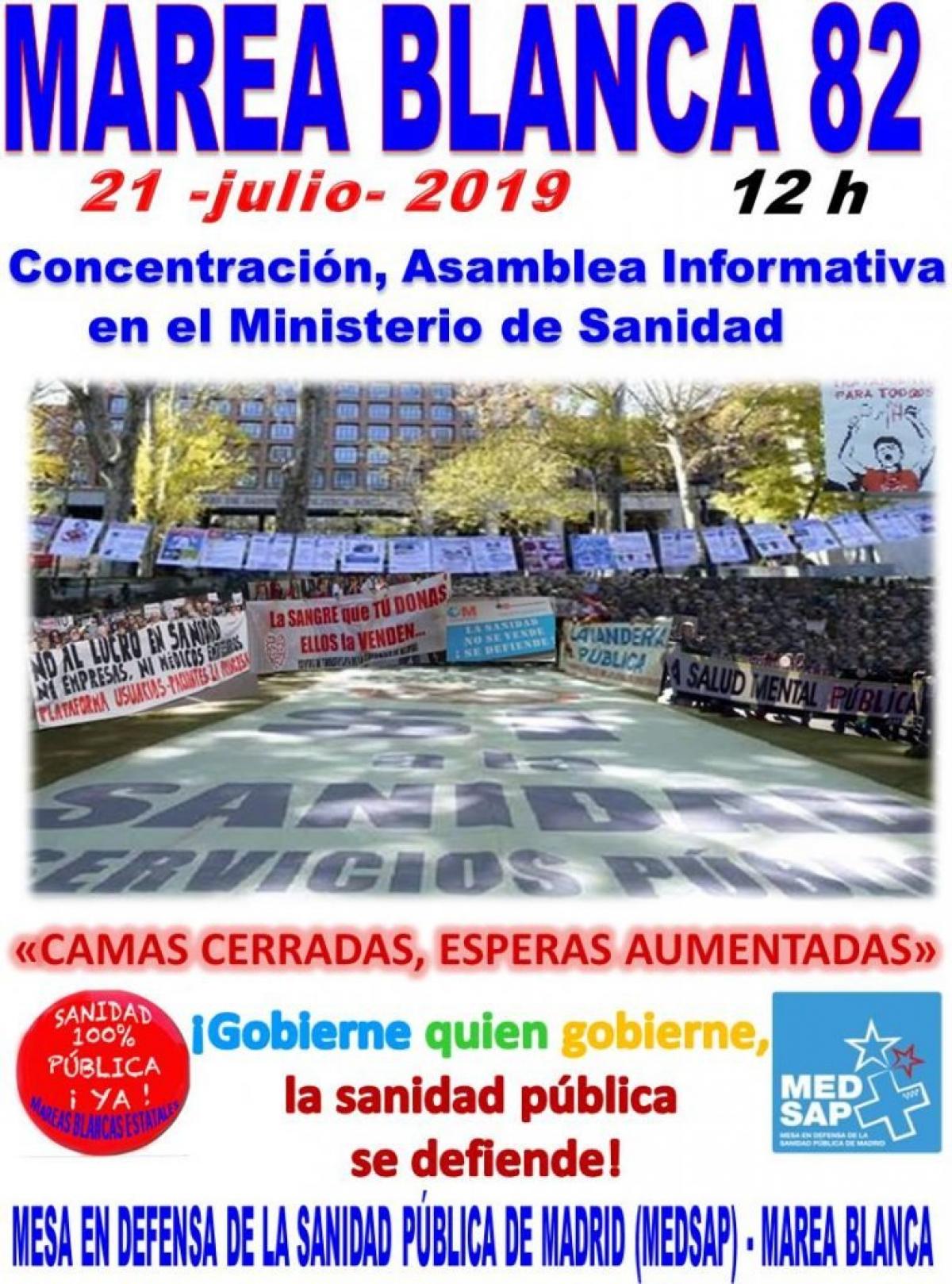 El próximo domingo, 21 de julio, a las 12 horas, la Marea Blanca en defensa de la sanidad pública madrileña, de la que forma parte CCOO, volverá a manifestarse en Madrid. Será con una concentración ante el Ministerio de Sanidad.