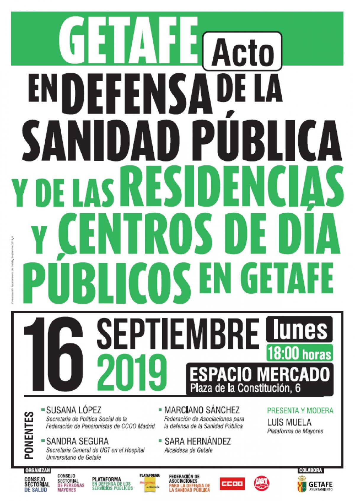 En Getafe las movilizaciones previstas se concretan en la convocatoria de una gran manifestación. Previamente se llevará a cabo un acto en defensa de la sanidad pública y de las residencias y centros de día públicos, que tendrá lugar el 16 de septiembre, a las 18 horas, en el Espacio Mercado (Plaza de la Constitución), organizado por el Consejo Sectorial de Salud, Consejo Sectorial de Personas Mayores, Plataforma en Defensa de de los Servicios Públicos, Plataforma mayores de Getafe, Federación de Asociaciones para la Defensa de la Sanidad Pública y los sindicatos comarcales de CCOO y UGT.