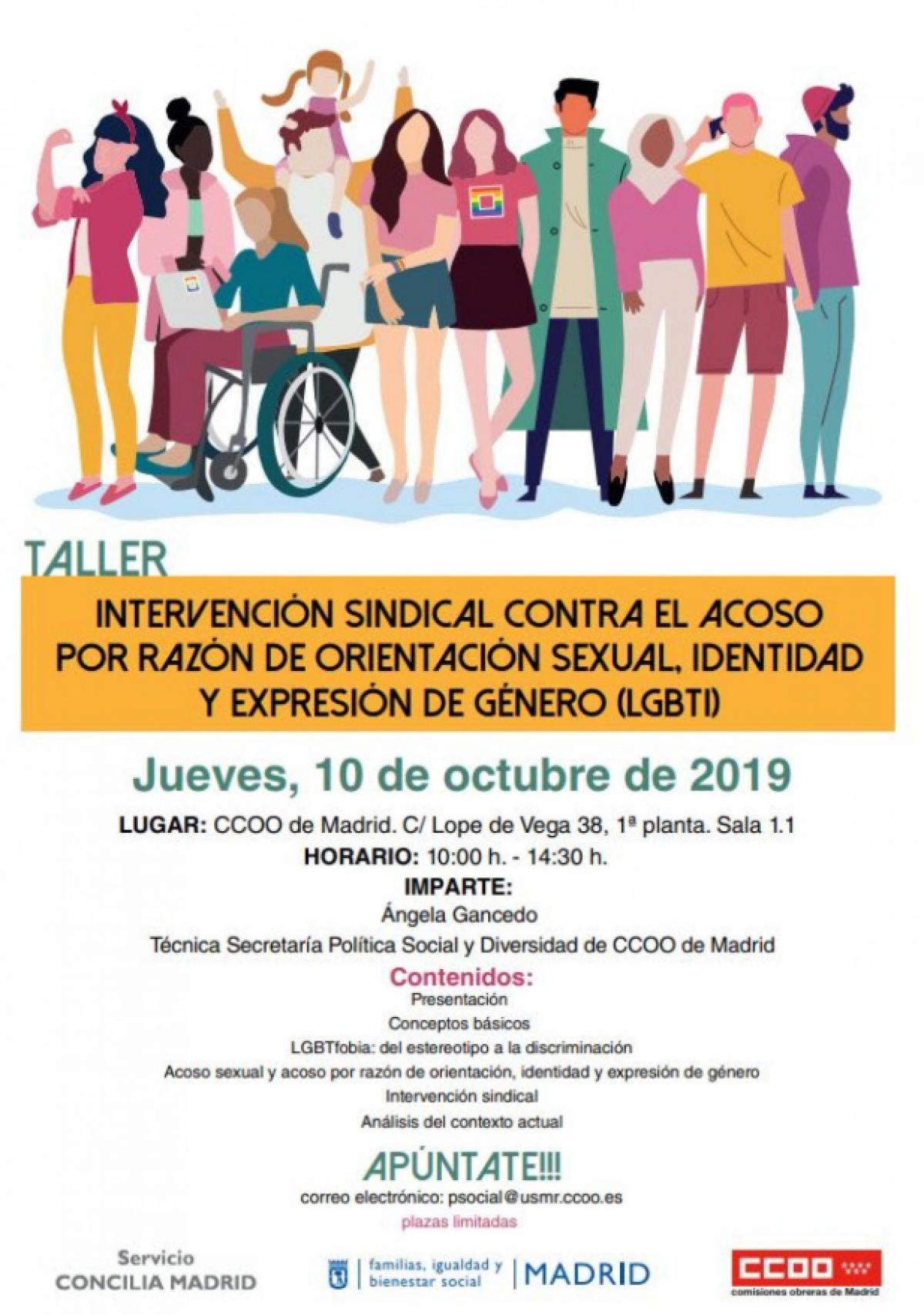 Por ello, la Secretaría de Política Social y Diversidad de CCOO de Madrid, en el marco del servicio CONCILIA MADRID desarrollado en colaboración con el Ayuntamiento de Madrid,llevará a cabo un Taller de formación y sensibilización de carácter básico en materia de acción sindical contra el acoso hacía las personas LGBTI, dirigido a delegados y delegadas sindicales y a la afiliación en general.