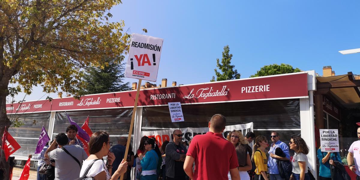 CCOO ha convocado una concentración este jueves, 10 de octubre, a las 12,30 horas, frente al restaurante La Tagliatella, en Boadilla del Monte (Avenida Infante Don Luis, 8 bis), para protestar contra el despido de diez empleados que han decidido presentarse en la candidatura del sindicato para representar a sus compañeras y compañeros en la defensa de sus intereses en el primer proceso de elecciones sindicales en esta empresa.