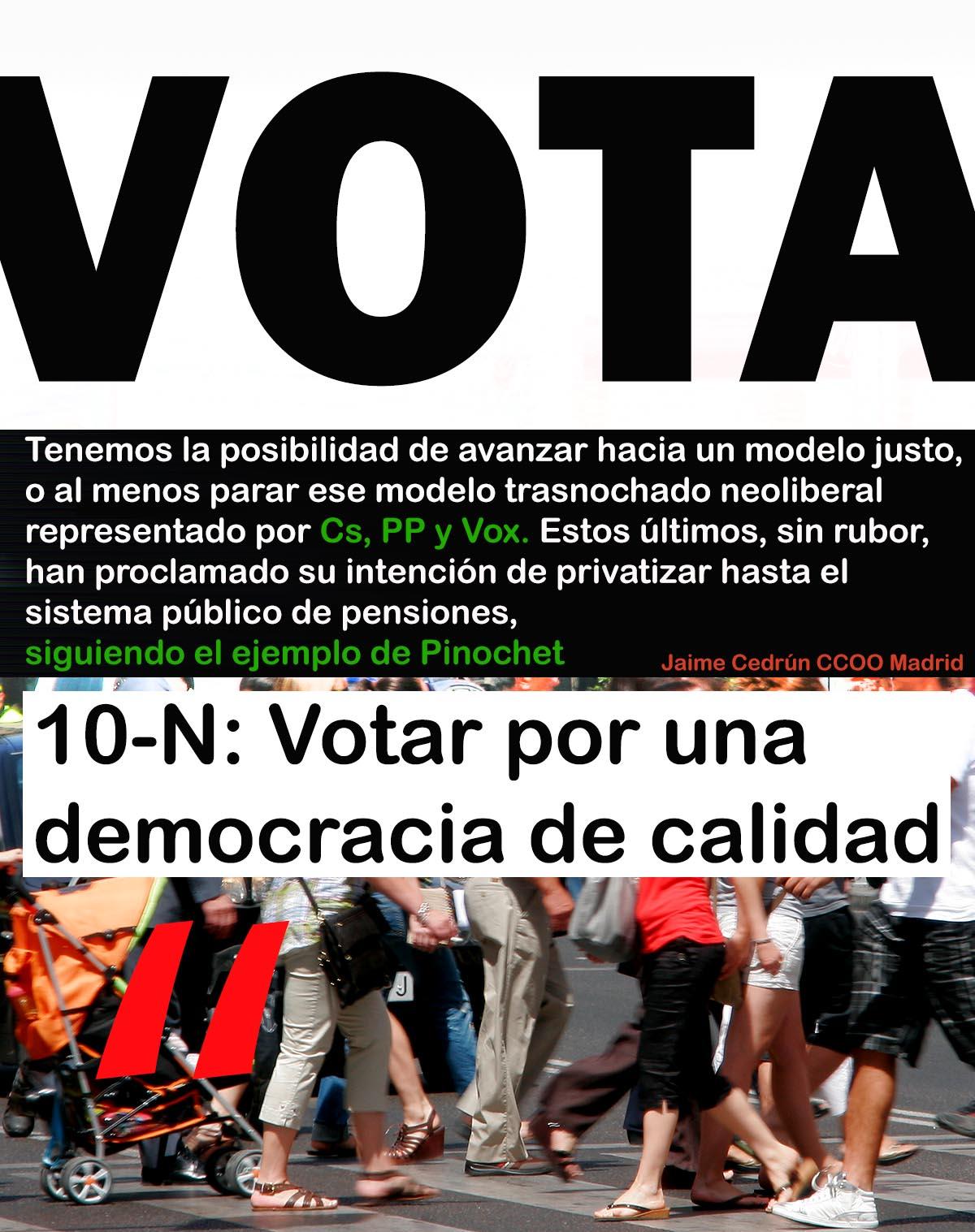 La medicina básica para que una democracia tenga calidad es la participación. El próximo domingo hay que ir a votar por mucho desencanto que haya llevado a nuestras vidas la irresponsabilidad de los liderazgos políticos. El único arma que tiene la clase trabajadora, las personas excluidas o en riesgo de exclusión es su voto, porque la experiencia nos dice que las derechas van a votar como un sólo ser. Hay que ir a votar por la recuperación de derechos, por un futuro de igualdad y un planeta sostenible. Sigue leyendo el artículo en Madridiario aquí >>>
