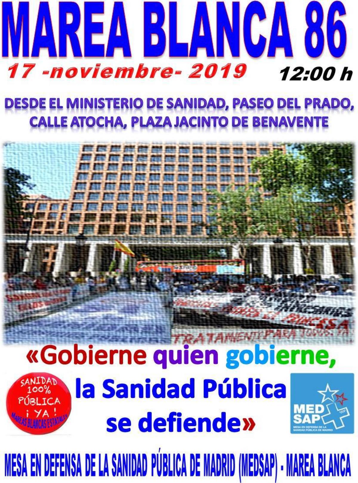 El próximo domingo, 17 de noviembre, a las 12 horas, la Marea Blanca, de la que forma parte CCOO, volverá a manifestarse en Madrid en defensa de la sanidad pública. La marcha irá desde el Ministerio de Sanidad hasta la plaza de Jacinto Benavente.