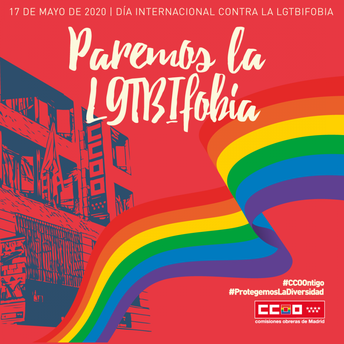 Bajo el lema "Paremos LA LGTBIfobia" #ProtegemosLaDiversidad, CCOO de Madrid pone en marcha esta campaña para conmemorar el 17 de mayo Día Internacional contra la LGTBIfobia que este año cumple 30 años. Ver materiales >>>