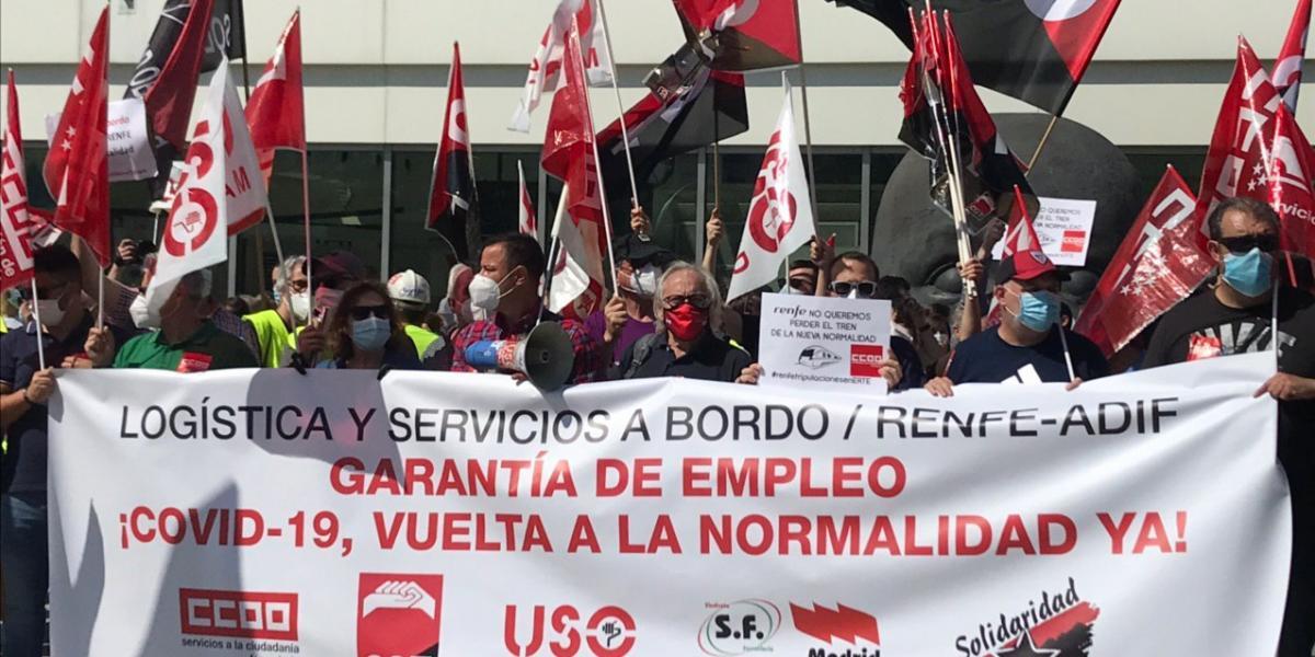 CCOO junto a CGT, SF, USO y Solidaridad Obrera, organizaciones sindicales de la empresa concesionaria de los servicios a bordo de trenes de alta velocidad y larga distancia de Grupo Renfe, han convocado concentraciones en diferentes ciudades del territorio nacional este viernes, 19 de junio, para reclamar la vuelta a la actividad de las 2.000 personas afectadas.