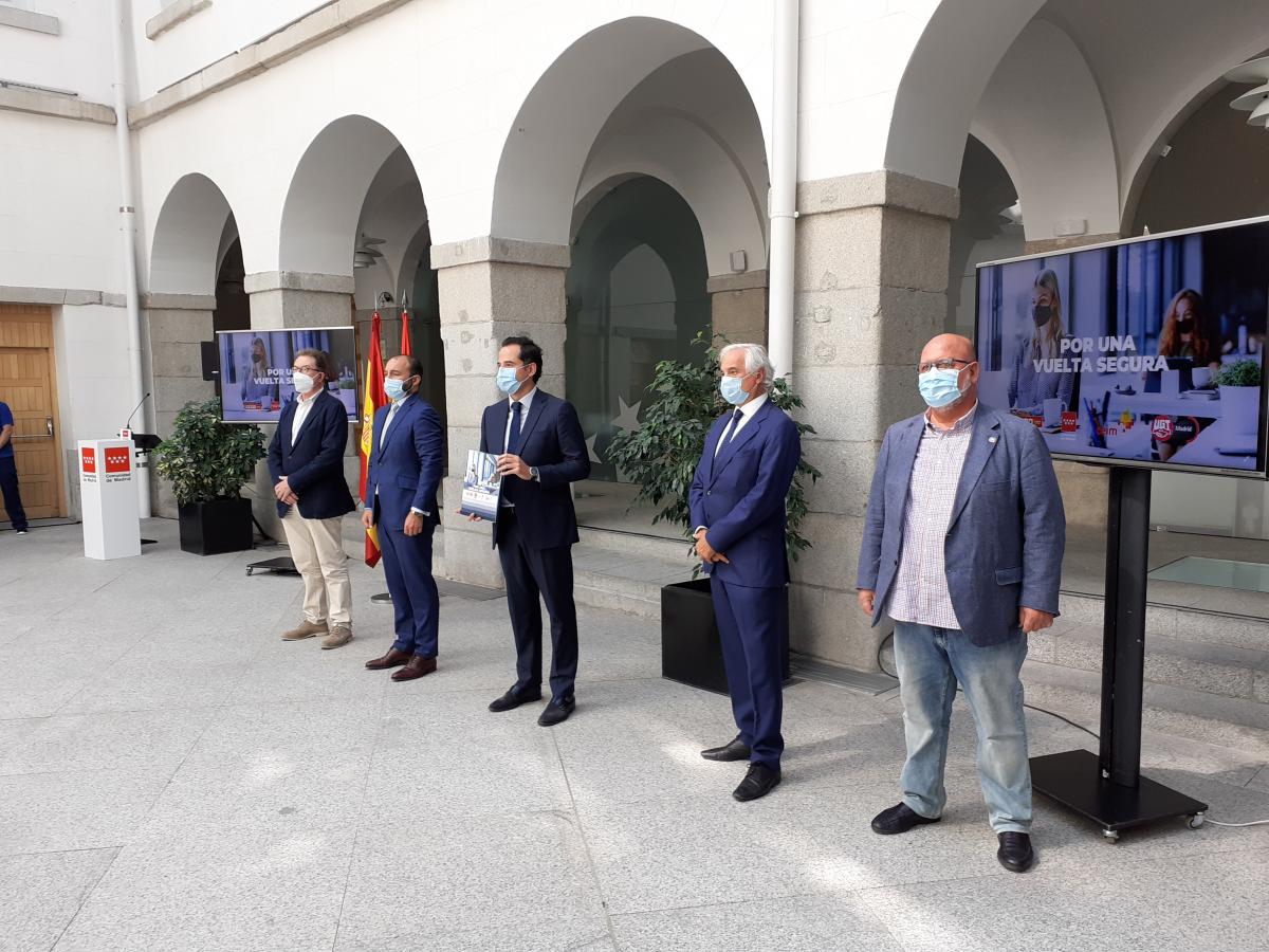 Los agentes sociales CCOO y UGT de Madrid y la patronal CEIM han firmado este lunes con la Consejería de Economía, Empleo y Competitividad, un PROTOCOLO DE RECOMENDACIONES SOBRE LA “VUELTA SEGURA AL TRABAJO” que tiene como objetivo contribuir desde el ámbito laboral a fortalecer la protección de la salud de los/as madrileños/as, facilitando que la reincorporación al trabajo de muchas personas tras el período estival se produzca de forma segura, a través de recomendaciones que vienen a recordar y potenciar las medidas de Salud Pública, junto con una campaña de concienciación e información dirigida tanto a las empresas como a las personas trabajadoras.