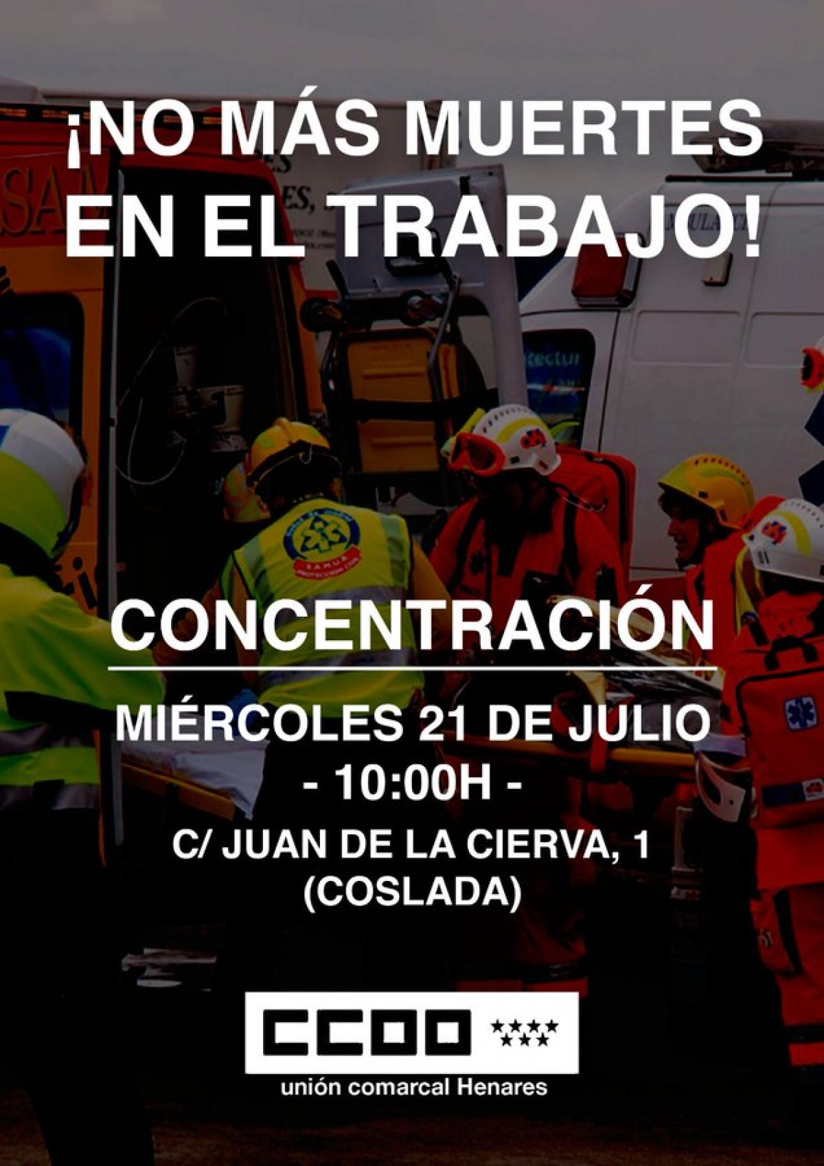 CCOO del Henares y UGT comarca Este han convocado conjuntamente una concentración mañana miércoles, 21 de julio, a las 10 horas, a las puertas del centro de trabajo donde sucedió el fatal accidente en Coslada (Juan de la Cierva, 1).