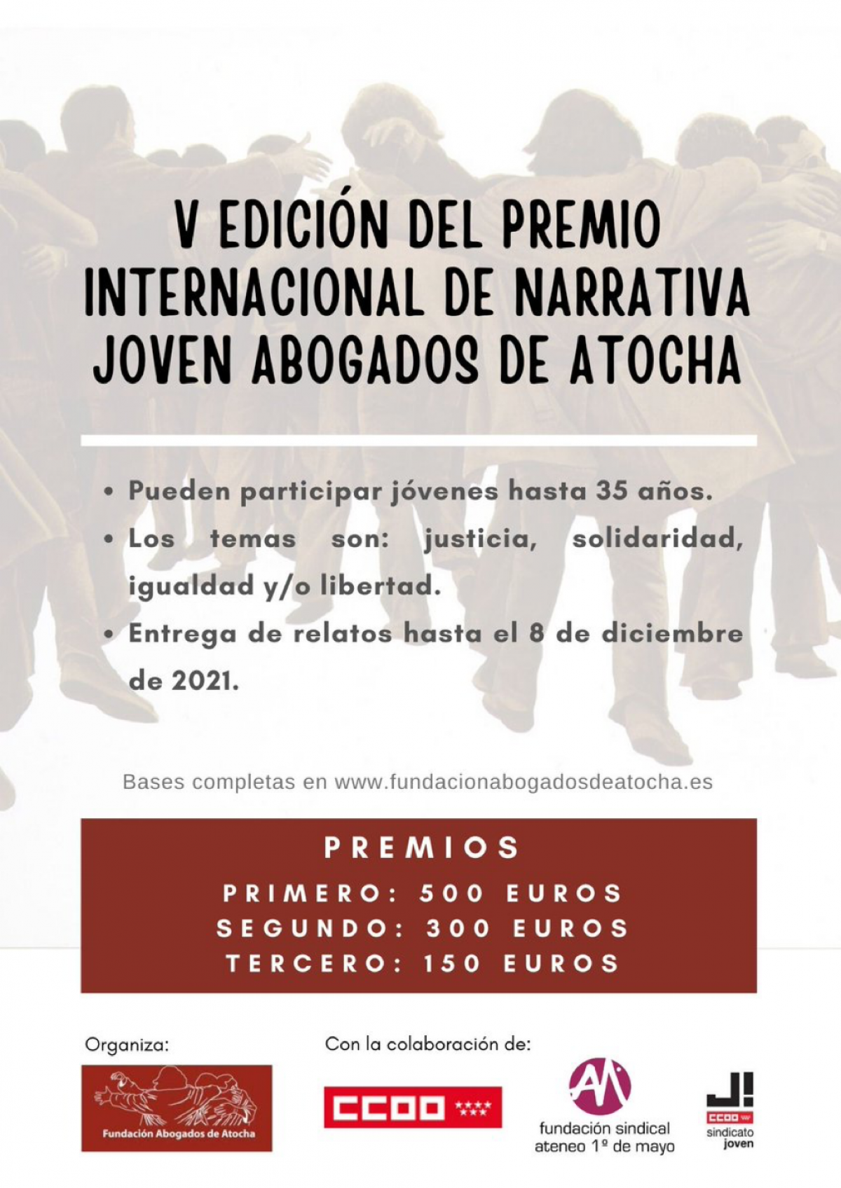 La Fundación Abogados de Atocha de CCOO convoca la quinta edición de su Premio internacional de narrativa joven, en colaboración con CCOO de Madrid, la Fundación Sindical Ateneo 1º de Mayo y el Sindicato Joven.