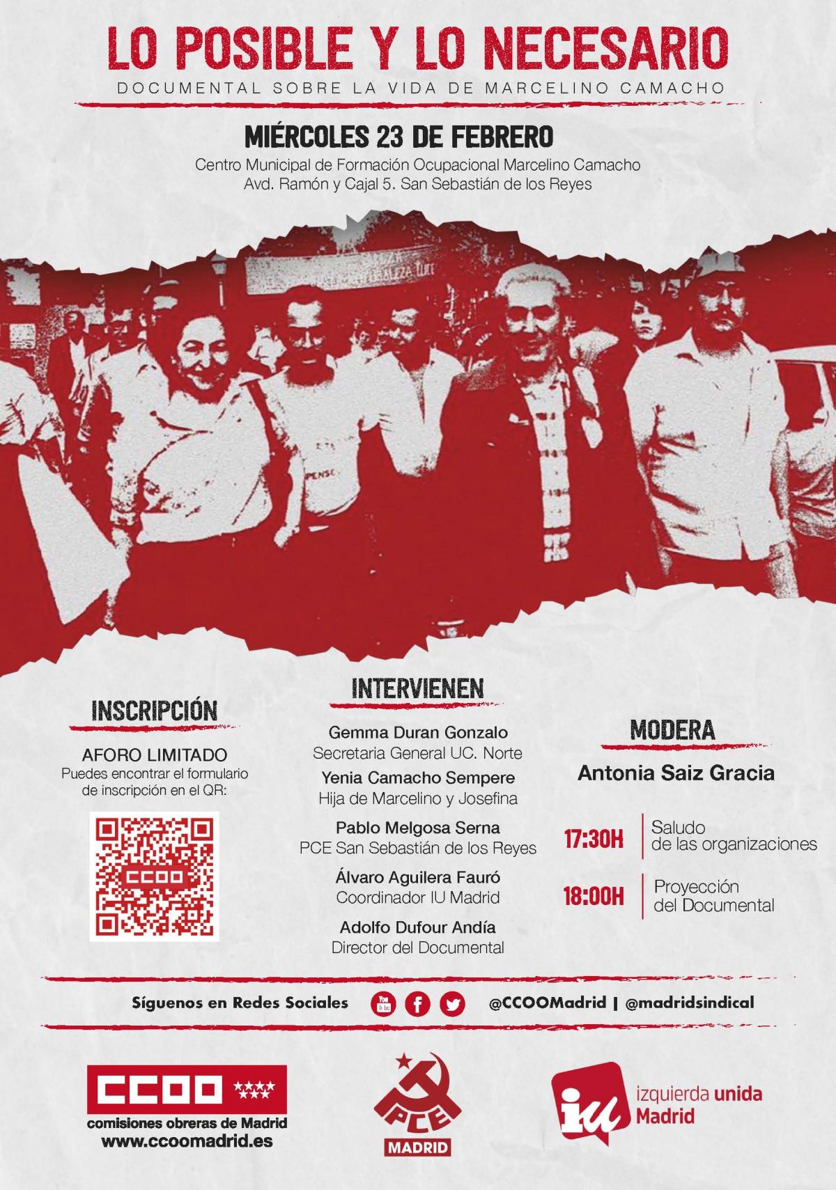 El próximo miércoles, 23 de febrero, a las 17,30 horas, en el Centro Municipal de Formación Ocupacional Marcelino Camacho de San Sebastián de los Reyes (Av. Ramón y Cajal, 5), tendrá lugar la proyección del documental “Lo posible y lo necesario”.
