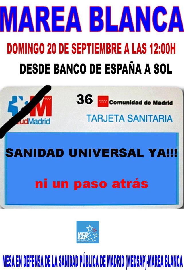 El próximo domingo, 20 de septiembre, CCOO volverá a salir a la calle en Madrid, como integrante de la Marea Blanca en defensa de la sanidad pública y universal. A las 12 horas, desde el Banco de España hasta la Puerta del Sol.