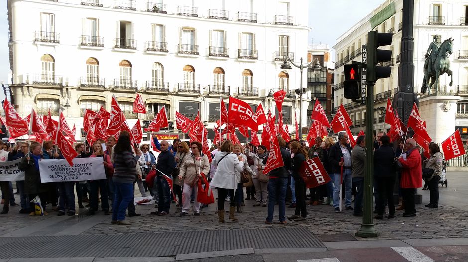 En la mañana de hoy casi un centenar de personas se han concentrado frente a la sede de la Comunidad de Madrid en la Puerta del Sol, para denunciar la mala situación de la limpieza en los centros de salud de la región por falta de personal.
