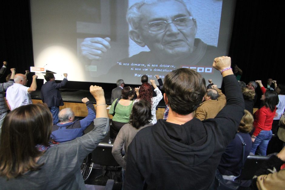 Las Comisiones Obreras de Madrid han conmemorado con una multitudinaria asamblea el quinto año del fallecimiento de Marcelino Camacho. Se ha tratado de un acto diferente, “coral, participativo, plural”, en palabras de Jaime Cedrún, secretario general de CCOO de Madrid; o como lo ha calificado Marcel Camacho, hijo de Marcelino, “una herramienta. Porque no tiene sentido un homenaje que no sirve como una herramienta”. Para Ignacio Fernández Toxo, secretario general de la CS de CCOO “el homenaje a Marcelino es el propio sindicato.” “Marcelino vive, está en las Comisiones Obreras mientras sigamos luchando al grito de ni nos domaron, ni nos doblegaron, ni nos van a domesticar, tal como han hecho los compañeros de Coca Cola”, proclamaba Jaime Cedrún en la inauguración de la asamblea.